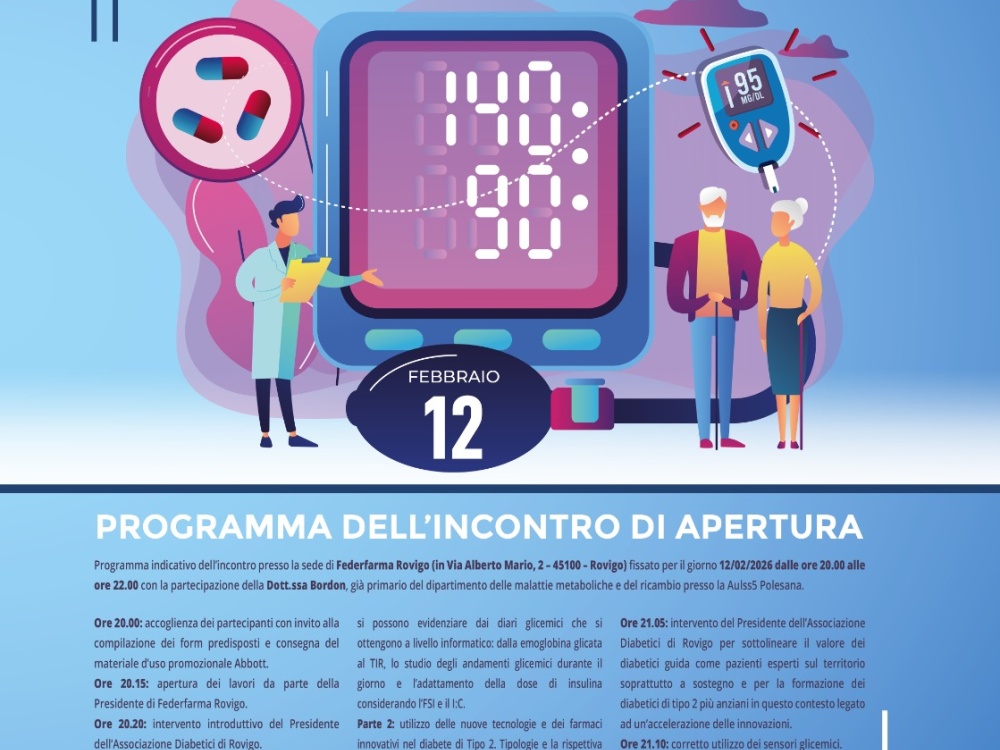 Federfarma Rovigo e l’Associazione Diabetici di Rovigo ODV, nell'ambito di un percorso di collaborazione per sensibilizzare i cittadini sull’importanza della diagnosi precoce del diabete, organizza