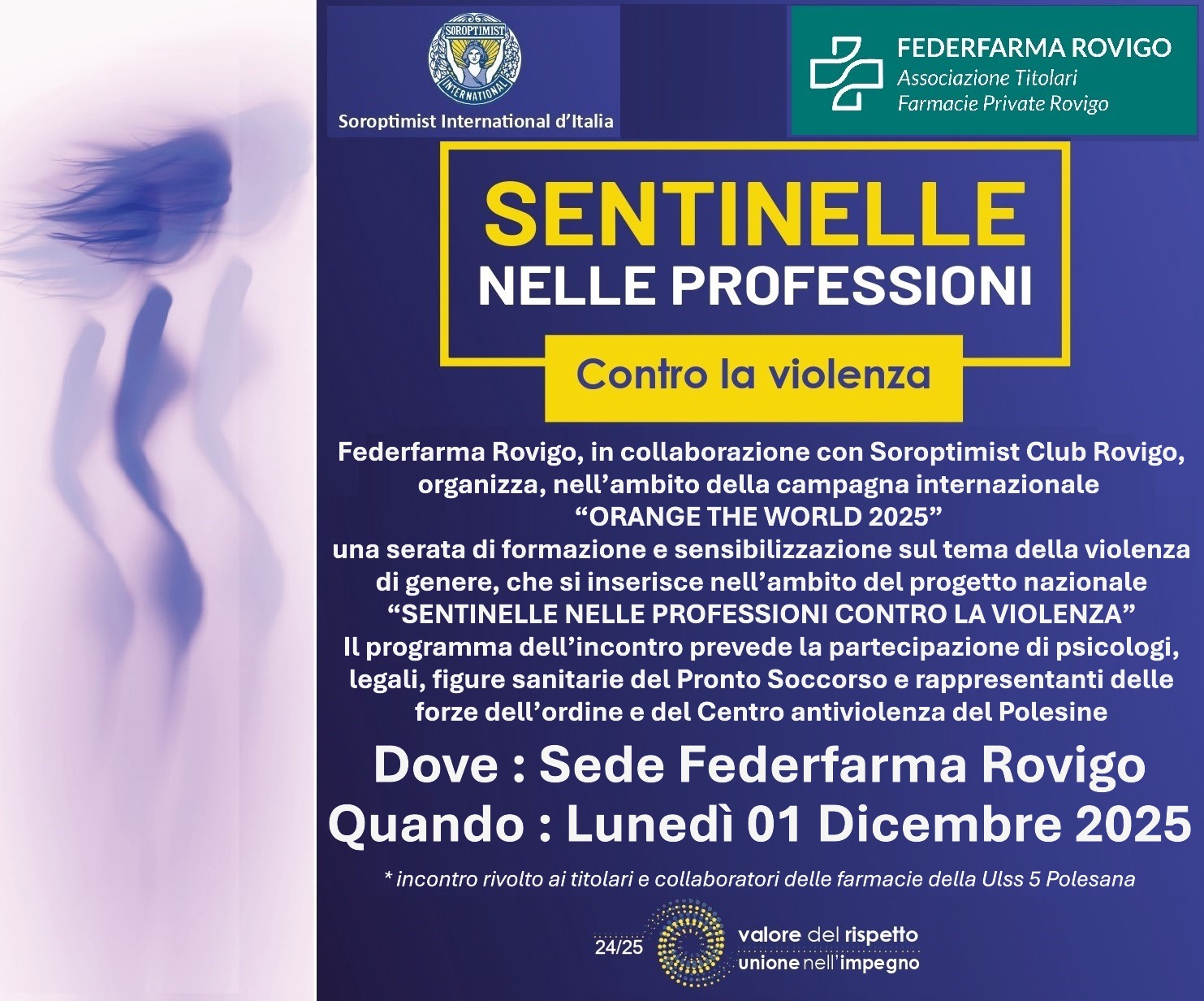 Nell'ambito della campagna internazionale "Orange The World 2025", Federfarma Rovigo e Soroptimist Club Rovigo organizzano una serata di formazione e sensibilizzazione sul tema della violenza di genere.